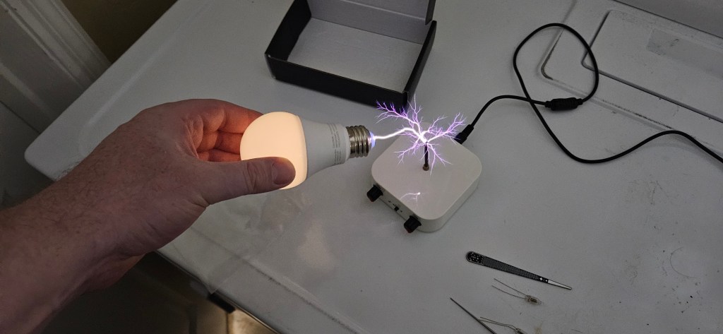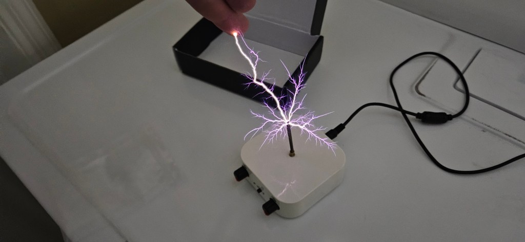 Arriving home I received a package from my Dad but I had no idea what he sent. When I opened the package there was a tesla coil. I had no idea what this device was. Then I staretd to play with it and found it to be really cool. I held a light bulb close to it and the bulb lit up. I have a few other pictures and a video showing this educational toy that I think others might enjoy. Here is the amazon product page if you want to purchase. https://amzn.to/4loGlYg